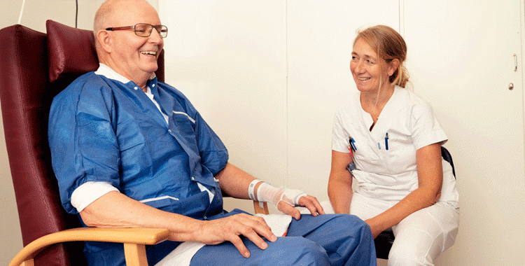 ”Jeg har det meget behageligt,” svarer han sygeplejerske Helle Luther Hoff, da hun spørger til hans velbefindende.