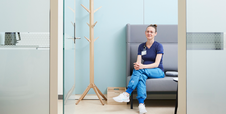 ”Vi ville gerne have, at rummene mindede så lidt om resten af afdelingen som muligt. De fysiske rammer satte nogle naturlige begrænsninger, men alt i alt er det en klar forbedring fra før,” siger hun, da Sygeplejerskens udsendte tager plads i sofaen.