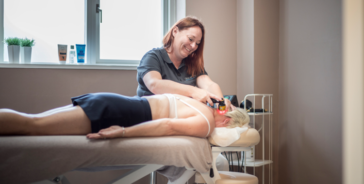 Jeg arbejder med hele systemet: nerver, lymfesystem, led, muskulatur og trigger points,” forklarer Tina Harndahl, mens hun roligt fører laseren ned over klienten. Hun arbejder med LLLT, eller Low Level Laser Therapy, i den private smerteklinik Clinic of Life i Vejle.