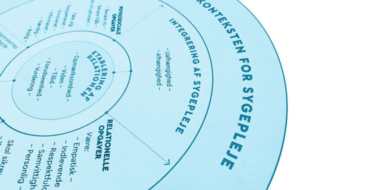 Begrebsrammen rummer tre dimensioner, som på figuren er afbilledet i tre cirkler, se Figur 1. Den inderste cirkel omhandler etablering af relationen, miderste cirkel har fokus på integrering af sygeplejen, og den yderste cirkel arbejder med den kontekst, som sygeplejen tager afsæt i (1,2).