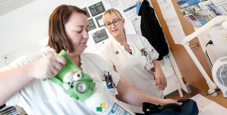 Et andet sted har hendes kollega Dorte Wittendorff været ved at samle alt det, der skal til, for at hun kan følge en anden patient hjem. Hun har alle papirer, medicin mv. i en taske, og hun har også en lille iltbombe, som kommer med til køreturen. Nogle patienter er iltbrugere, og derfor har de også behov for ilt på hjemturen.
