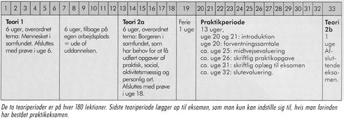 Teori 1 er på seks uger og udgør 180 lektioner. Det overordnede tema for forløbet er 'Mennesket i samfundet'. (Se figur 1). Teoriforløbene er opbygget på en sådan måde, at fem fag er ligeligt repræsenteret (25 timer til hvert fag på teori 1). De fem fagområder er Den Sociale- og samfundsfaglige gruppe, den kulturelle og aktivitetsfaglige gruppe, den praktiske faggruppe, den pædagogiske-psykologiske gruppe og den plejemæssige gruppe.
