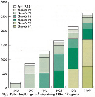 | Kilde: Patientforsikringens Årsberetning 1996. | Kilde: Patientforsikringens Årsberetning 1996. * Prognose. |