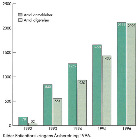 2.111 patienter anmeldte skader i løbet af 1996 mod 1.658 året før. Det er en stigning på 27 procent, men det er der ikke noget alarmerende i (figur 1), skriver Patientforsikringen i årsberetningen for 1996.