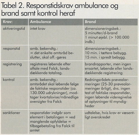 Kravet til brandvæsenet er en reaktionstid på højst 15 minutter. For ambulancevæsenet er der kun fastsat nogle gennemsnitlige responstider, der ikke siger noget om, hvor hurtigt den enkelte ambulance skal være fremme.
