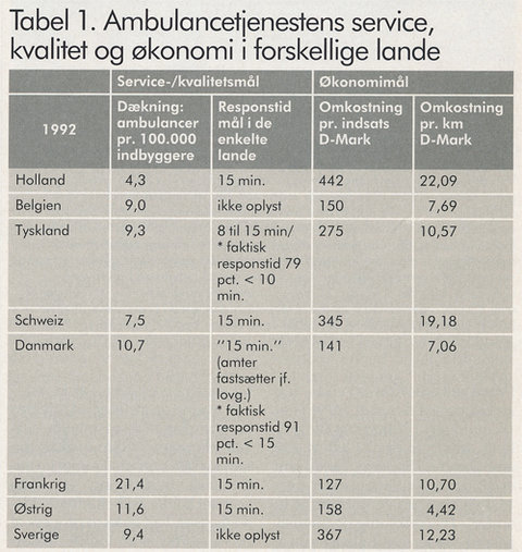 I Vestsjællands Amt er 11 ud af 100 ambulancer ikke nået frem efter 15 minutter. I Viborg og Ringkøbing Amter er det 13 ud af 100 ambulancer. I Sønderjyllands Amt er 18 ud af 100 ambulancer over 15 minutter om at nå frem. I to amter – Frederiksborg og Sønderjylland – er fem ambulancer ud af 100 over 20 minutter om at nå frem.