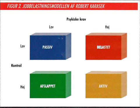 Jobbelastningsmodellen er udviklet af amerikaneren Robert Karasek. Modellens hypotese er, at psykosocial belastning er et resultat af den kombinerede effekt at et psykisk krævende arbejde og manglende kontrol. Figur 2 viser belastningstilstande, hvor forskellige niveauer af psykiske krav og kontrol er kombineret. Belastet er kombinationen af høje psykiske krav og lav kontrol. Denne tilstand kan medføre depressioner, søvnproblemer, udmattelse, medicinforbrug og utilfredshed. Kombinationen af høje psykiske krav og høj kontrol benævnes aktiv, hvilket giver mulighed for udfordrende og stimulerende arbejde uden øget sygdomsrisiko. Kombinationen af lave psykiske krav og lav kontrol benævnes passiv. Denne tilstand giver ikke medarbejderne mulighed for at udnytte deres færdigheder, og kombineret med manglende jobudfordringer kan dette medføre psykologisk belastning og sygdom. Ud over belastningshypotesen er der læringshypotesen, som antager, at læring og personlig udvikling har de bedste muligheder i aktive job i modsætning til passive job. Modellen har således to diagonaler. Belastningsdiagonalen fra lav til høj belastning og læringsdiagonalen fra passive til aktive job.