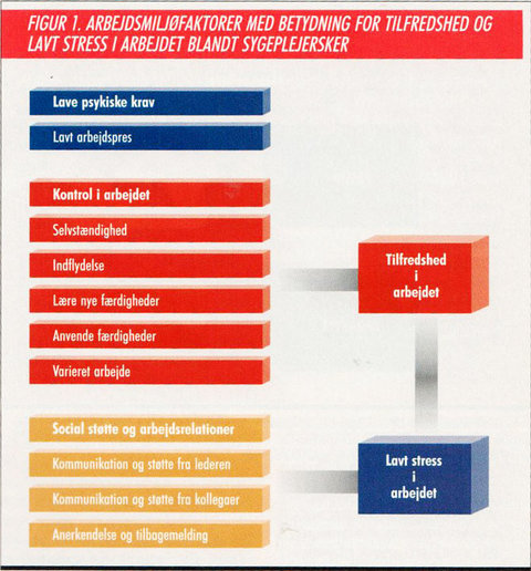 Sygeplejersker, som er tilfredse i deres arbejde, oplever, at arbejdstempoet er lavt, og at de har tilstrækkelig tid til arbejdet (lave psykologiske jobkrav) (1,2). De føler, at de har muligheder for at udnytte de færdigheder, de har, og for at lære nye færdigheder, at der er behov for kreativitet og initiativ i arbejdet (1,2), samt at arbejdet er tilpas varieret (3). De oplever, at de har medindflydelse og er med til at bestemme, hvordan og hvornår arbejdet udføres, samt hvilke opgaver der skal udføres (høj jobkontrol) (1,2,3).