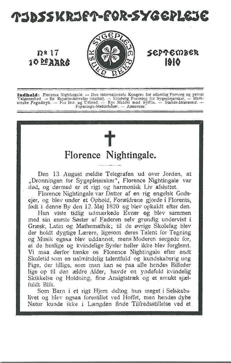 Meddelelse om Florence Nightingale's død i Tidsskrift for Sygepleje nr. 17 1910.