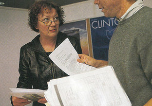 Det diskuteres løbende, hvordan det faglige sof skal vægtes i forhold til det øvrige stof.(Sygeplejefaglig medarbejder Anne Vesterdal og redaktionssekretær Henrik Boesen). Foto: Søren Svendsen.