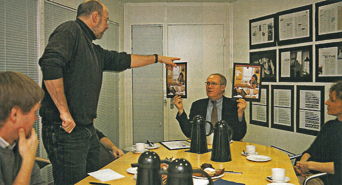 Det er ikke ligegyldigt, hvordan en forside ser ud. Fotograf Folkver argumenterer over for chefredaktør Peter Skeel Hjorth. Foto: Søren Svendsen.
