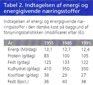 Beregninger på basis af forsyningsstatistikken viser tilsvarende ændringer i energifordelingen. I tabel 2 ses ændringer i indtagelsen af energi og energigivende næringsstoffer gennem de seneste 40 år på basis af forsyningsstatistikken.