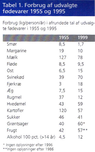 Generelt er forbruget af læskedrikke og sodavand og slik steget og udgør nu en stor del af børns høje indtagelse af sukker. Forbruget af øl og vin er steget voldsomt. Ølforbruget er dog faldet i de senere år, men vinforbruget er fortsat stigende. I tabel 1 er angivet forbruget af udvalgte fødevarer i 1955 og 1995.