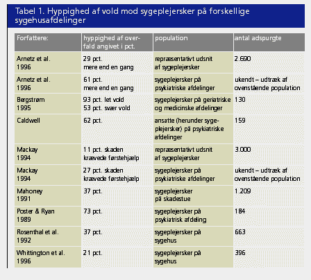 De tilgængelige undersøgelser af vold mod sygeplejersker viser, at sygeplejersker på psykiatriske afdelinger er særlig udsatte for voldelige hændelser. (Se tabel 1).