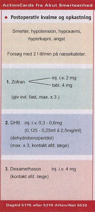 Actioncards til brug for afdelingerne beskriver behandling af smertegennembrud, kvalme og opkastning, respirationsdepression, motorisk blokade og hypotension ved epidural smertebehandling. Her actioncard for ''Postoperativ kvalme og opkastning.''