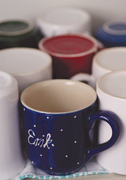 Der står en blå kop med hvide prikker i et skab på afdelingen. Erik, står der med farvede bogstaver. De andre kopper har ingen navne.
