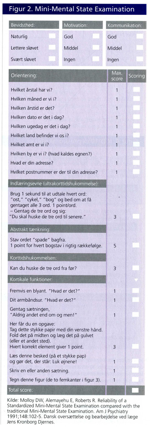I Danmark er MMSE et veletableret screeningsinstrument for kognitiv dysfunktion. MMSE bruges af praktiserende læger og af sygeplejersker, f.eks. i Aalborg Kommune (3,11).