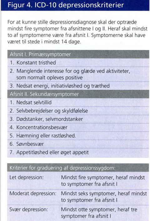 De aktuelt gældende kriterier for at stille depressionsdiagnose kaldes ICD-10-kriterierne for depressionssygdom. ICD-10 er en forkortelse for det engelske International Classification of Diseases, 10th Revision. Diagnoseklassifikation ligger i WHO-regi. ICD-10-depressionskriterierne fremgår af figur 4. Vurdering efter ICD-10 er en lægelig opgave.