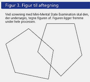 Der hører to hjælpemidler til MMSE. Et stykke pap, hvor der med store bogstaver står ”Luk øjnene,” og en forstørret tegning af to femkanter, der er flettet ind i hinanden (se figur 3 side 24). Forud for screening for MMSE vurderes følgende funktioner: Bevidsthed, motivation og evnen til kommunikation (figur 2).
