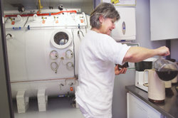 ”Jeg tager imod patienterne, tager blodtryk, følger dem ind i kammeret og beroliger dem, der har tendenser til klaustrofobi. Jeg skiftes med bl.a. trykkammerlederen til at gå rundt derinde, mens kammeret bliver tryksat, og patienterne får hætten på. Jeg bliver dog ikke i kammeret under selve behandlingen, men der er hele tiden øjenkontakt gennem vinduerne. Og det er meget væsentligt,” understreger Annet Schack von Brockdorff.