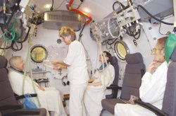 I modsætning til, hvad mange tror, er trykkammeret ikke kun til for dykkere, der kommer for hurtigt op til overfladen og bliver fløjet ind fra fjerne vande med helikopter og stor dramatik. De fleste patienter i trykkammeret er i daglig behandling - seks uger i træk - for stråleskader efter en vellykket cancerbehandling. I de tilfælde er de små pulsårer i vævet skadet, og antallet af små blodkar formindsket. Derfor kommer der ikke ilt nok ud i det bestrålede væv, og det heler ikke, som det skal. Trykkammerbehandlingen, der kaldes HBO-behandling (HyberBar Oxygenbehandling), standser ødelæggelsen af de små pulsårer og transporterer ilt ud i vævet, hvorved der dannes nye blodkar.
