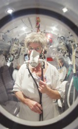 Hun er trykkammeroperatør, forsker, og den, der har sørget for en ny opvaskemaskine i køkkenet. Og så er hun eneste kvinde. Man kunne tro, at hun arbejdede på et fragtskib eller måske i et nørdet rumforskermiljø. Men faktisk er hun sygeplejerske. I kælderen på Rigshospitalet.