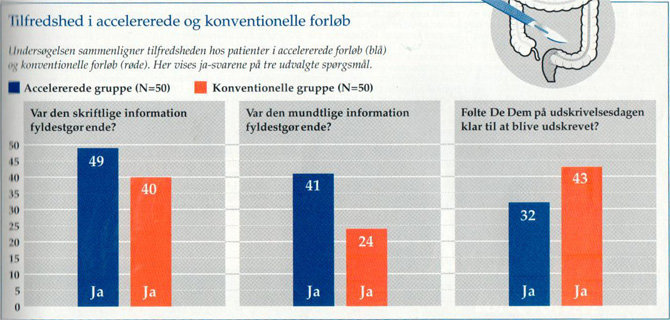 Tilfredse. Den grundige information af patienterne i accelererede kolonkirurgiske forløb giver resultater. En sammenlignende undersøgelse viser klart større tilfredshed med informationen hos patienter i accelererede forløb end hos patienter i konventionelle forløb.