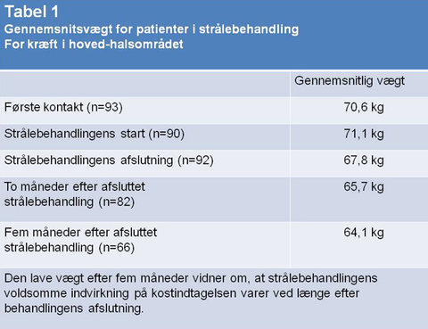 Vægttabskurve målt på fem udvalgte tidspunkter i forløbet viser størst gennemsnitligt vægttab under strålebehandlingen, men samtidig et vægttab, der fortsætter i op til fem måneder efter afsluttet strålebehandling. Patienterne har gennemsnitligt tabt 6,5 kg (9 pct. af den gennemsnitlige legemsvægt) (Se tabel 1.)