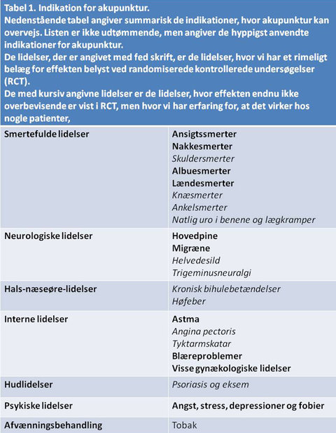 Generelt kan akupunktur anvendes til behandling af alle smertefulde lidelser, dog hovedsageligt i bevægeapparatet. F.eks. lændesmerter, nakkesmerter, tennisalbue etc. Herudover har akupunktur vist sig velegnet ved behandling af migræne og hovedpine, og der er i dag også dokumentation for, at akupunktur kan anvendes ved stress og lettere depressioner og f.eks. dysmenore (tabel 1).