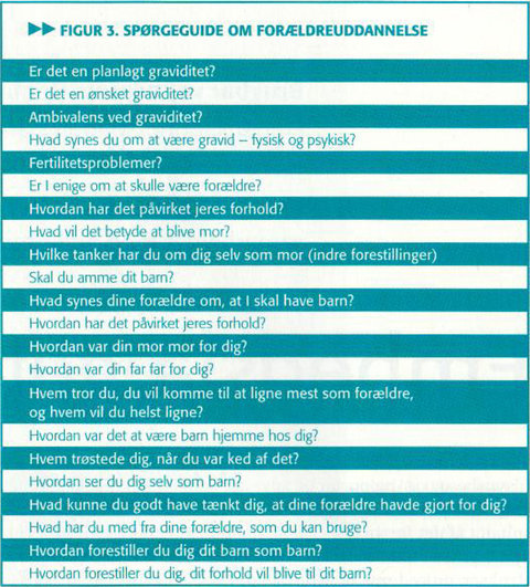 I terapirummet arbejdes med forældredannelsen og den tidlige tilknytning mellem mor og barn. Mobilteamet arbejder systematisk og målrettet med temaet via en spørgeguide (se figur 3).