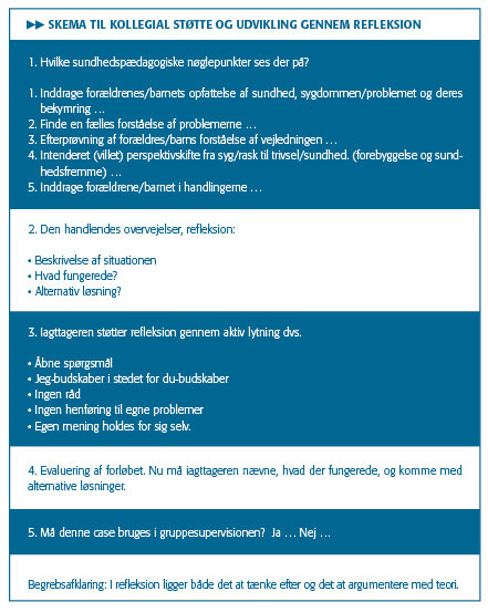 Kurserne i sundhedspædagogik og kommunikation er tilrettelagt med aktiv deltagelse i form af rollespil og refleksion og en begrænset mængde teori. Til brug i supervisionen blev der sammen med personalet udarbejdet en standard med fem sundhedspædagogiske temaer (se skema).