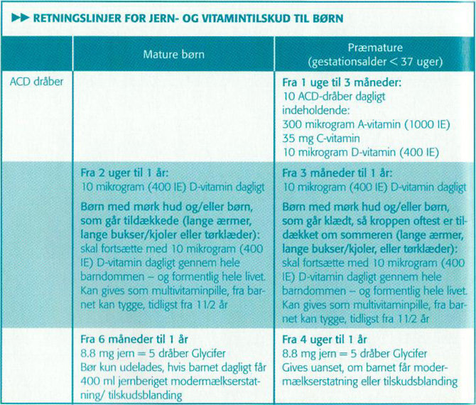 Sundhedsstyrelsen udsendte den 28. juni 1995 anbefalinger for vitamin- og jerntilskud til mature og præmature børn. Sundhedsstyrelsen har fundet behov for at ændre disse anbefalinger. D-vitamintilskudsanbefalingerne til børn med mørk hud og børn, der går klædt, så kroppen oftest er tildækket om sommeren, er ændret. Det anbefales nu at fortsætte D-vitaminprofylaksen gennem hele barndommen - og formentlig hele livet - fordi nye danske undersøgelser dokumenterer en høj forekomst af D-vitaminmangel blandt disse grupper.