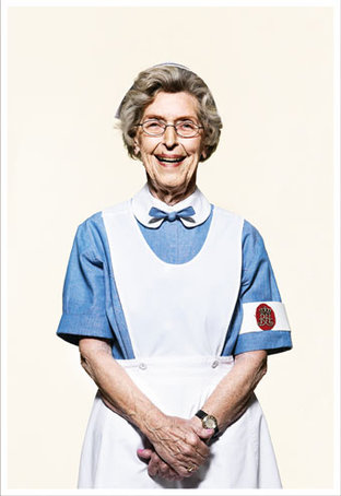 Alle fem kvinder har sygeplejerskeuniformer på, som stammer fra den tid, hvor de begyndte deres karriere. Uniformerne er lånt fra Dansk Sygeplejehistorisk Museum.
