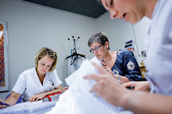 Abdominalcentret har op til 60 studerende i klinik. Lis Suhr har det overordnede ansvar for kvaliteten af den kliniske vejledning, og denne formiddag har hun været på hospitalet for at forberede supervision og undervisning, holde møde med de to kliniske vejledere, der begge er forholdsvis nye, og vejlede en studerende fra et afsnit, hvor der ingen klinisk vejleder er for øjeblikket.
