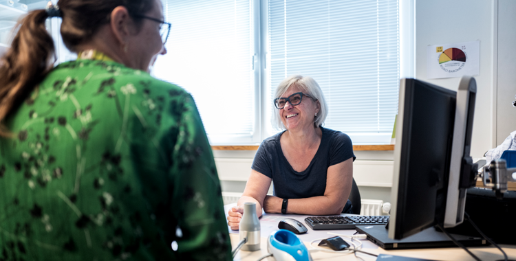 ”Den røde skal sidde på højre øre, den blå på venstre,” instruerer sygeplejerske Ingrid Krøyer og flytter fokus fra medarbejderen Lena Bech Holskov tilbage til skærmen, hvorfra hun kan styre høretesten. Lena Bech Holskov følger instrukserne. Kort tid efter er testen gennemført, og Ingrid Krøyer trykker resultatet frem på skærmen.