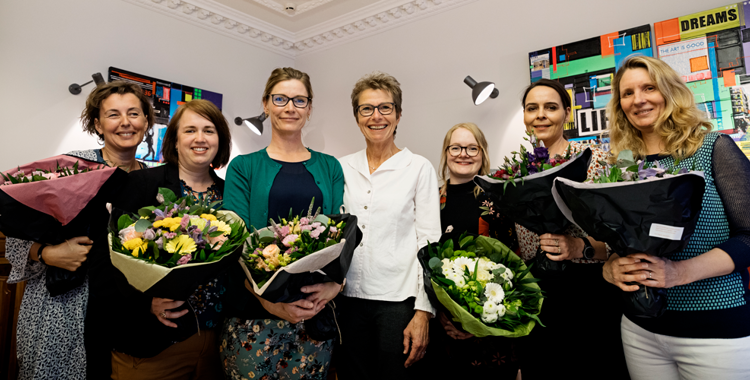 Dansk Sygeplejeråds formand Grete Christensen (i midten) ses her omgivet af modtagerne: fra venstre Charlotte Dyrehave, Birgit Refsgaard Iversen, Janni Strøm, Maria Pedersen, Maj Siercke og Julie Jacoby Petersen.