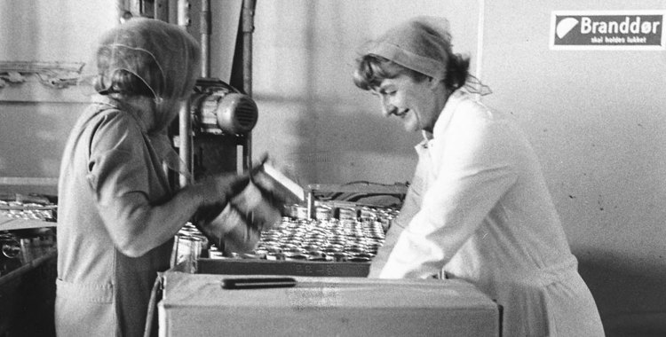Bedriftssundhedsplejerske Lizzi Sørensen giver et nap med ved udpakning af nye blikdåser på Plumroses konservesfabrik i Valby 1976. På det tidspunkt havde hun arbejdet på Plumrose i 10 år, hvor hendes indsats bl.a. havde resulteret i, at antallet af skader og arbejdsbetingede erhvervslidelser var faldet betydeligt.