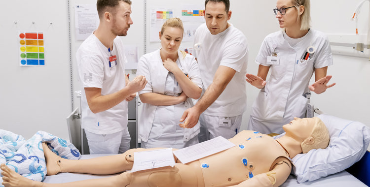 Sygeplejerskerne Ali Youssef, Isabella Jacqvé og Cecilie Toftdal og instruktør Simon Türck bøjer sig koncentreret over en dukke af en patient på sengen. Det er den 22. januar 2020 på Hvidovre hospital, og patienten skal forestille at være indlagt med hjerteproblemer.