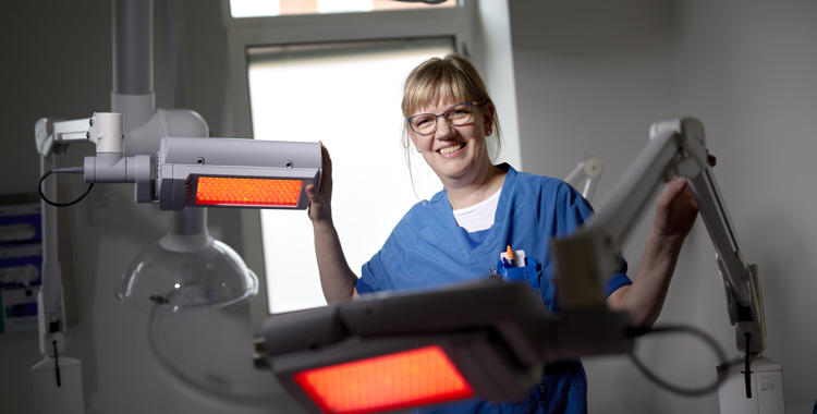“I dag havde jeg en ældre dame i laserenheden. Hun har basalcellekræft i et stort stykke af pandehuden og fik derfor Photo Dynamic Terapy, som er en lysbehandling.