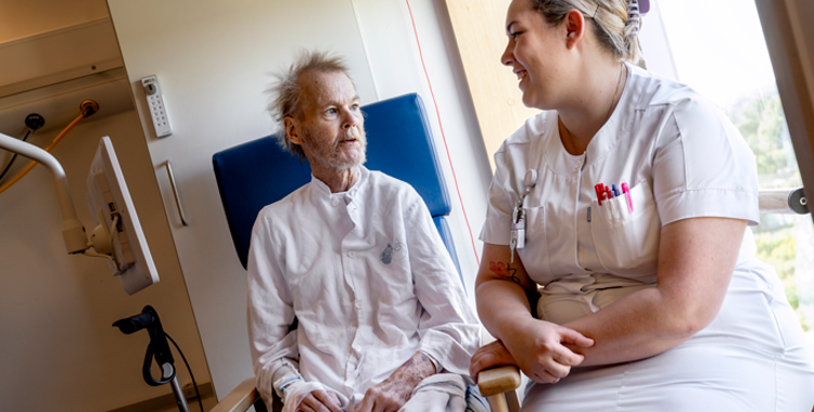 “Skal vi kigge på, hvad du har lyst til at spise til frokost?” foreslår Amalie Doran og svinger den tablet, der hænger over sengen, hen til Jes, der sidder i en stol ved det store hospitalsvindue.