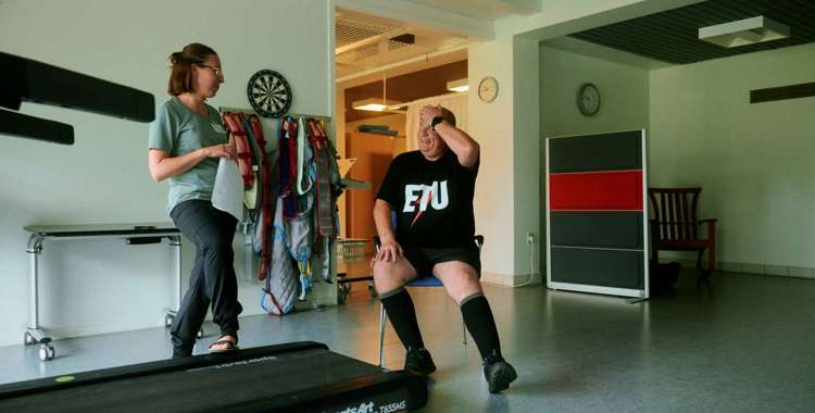 Fysioterapeuten Camilla Westen Jørgensen står ved siden af gangbåndet og superviserer. Hun har sat et stykke papir foran skærmen på gangbåndet, så Morten Kristiansen ikke kan se, hvor langt han har gået. Han skal nemlig mærke efter, hvor stor smerten er – og ikke gå efter et tidsmæssigt mål.