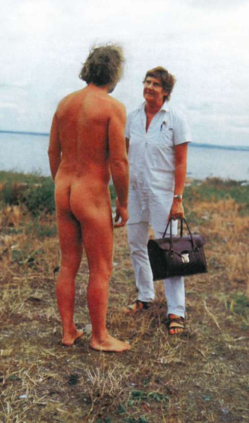 Dagen efter kigger jeg ud i ø-lejren for at se til patienten. Efter nogen søgen får jeg øje på ham. Han er godt solbrændt, og ikke en centimeter af hans krop er skjult for mig. Jeg står der i min tækkelige sygeplejeuniform og hvide cowboybukser og fører en lang samtale med denne stenaldermand, hvis eneste påklædning er en ring i det ene øre og et hæfteplaster over det ene øje; men det er bare i orden.