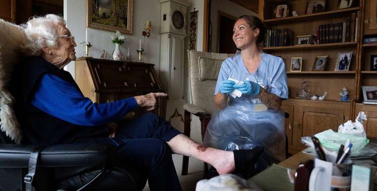 ”Må jeg kratte lidt i det?” spørger hjemmesygeplejerske Tanja Klamer Buchberg og kigger på et sår på 94-årige Asta Nielsens skinneben.