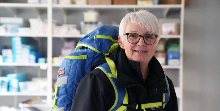 I en kælder i det nordvestlige København strammer sygeplejerske Karin Andersen de neongule stropper på sin rygsæk, så hun sikkert får fragtet alle remedier med ud i bilen.