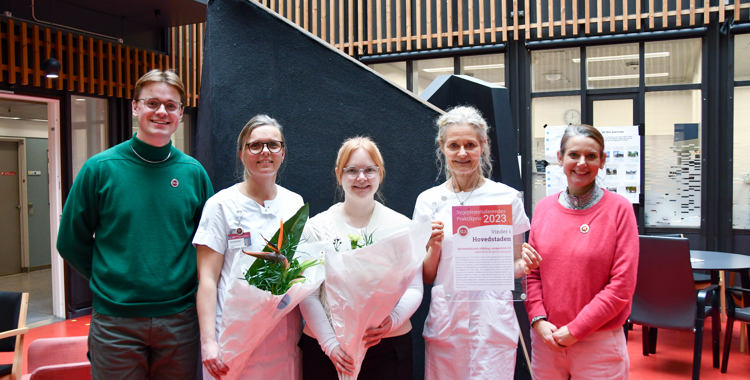 Fra venstre: Nicolaj Juhl (SLS), Trine Wessel Larsen (oversygeplejerske), Lisa Kramme Pedersen (tidl. sygeplejestuderende), Anne Ankerstjerne Sloth (klinisk underviser), Nanna Susé (DSR).