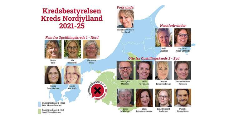 Bestyrelsen i Kreds Nordjylland består af 16 medlemmer: Forkvinde, to næstforkvinder, fem valgt i opstillingskreds nord og otte valgt i opstillingskreds syd.