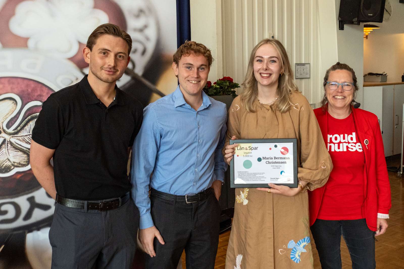 Maria Bermann Christensen fik Lån & Spar-legatet på 5.000 kroner for at blandt andet inspirere sine kolleger. Her sammen med to repræsentanter for banken og kredsnæstforkvinde Pia Jødal Næss-Schmidt.