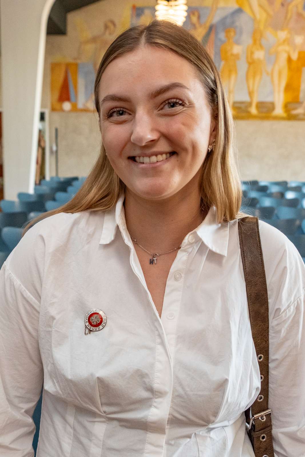 Nicoline Lønstrup Kristensen bærer stolt morfars kones nål, der har fået indgraveret hendes nye medlemsnummer, mens det gamle nummer har fået en diskret overstregning.
