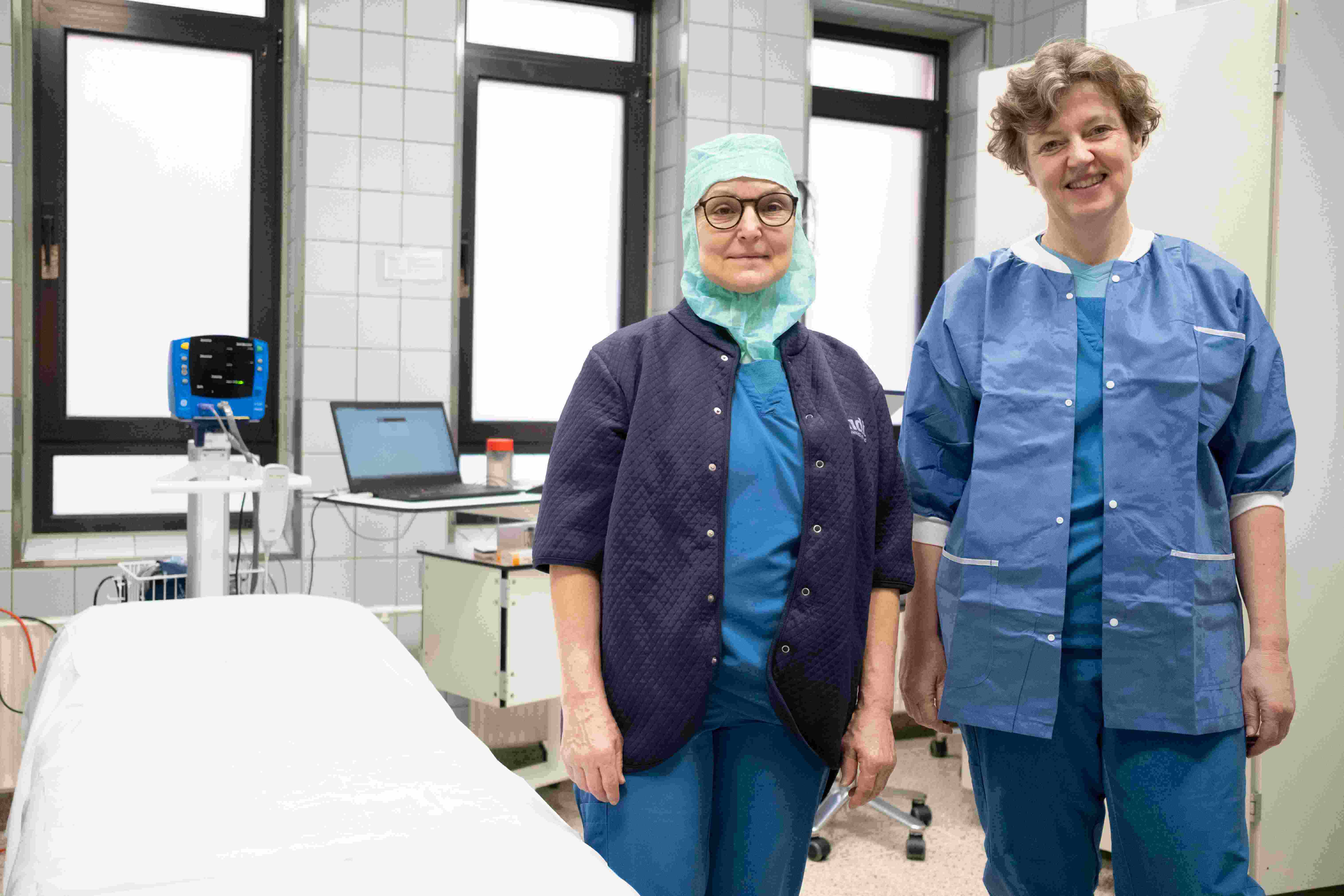 Hygiejnesygeplejerske Helle Gammelby Mogensen (tv) i en flergangsvarmejakke og oversygeplejerske Joan Kristensen (th) i en engangsvarmejakke. Billedet er ikke taget på en operationsstue. Foto: Kenneth Sletten Christensen