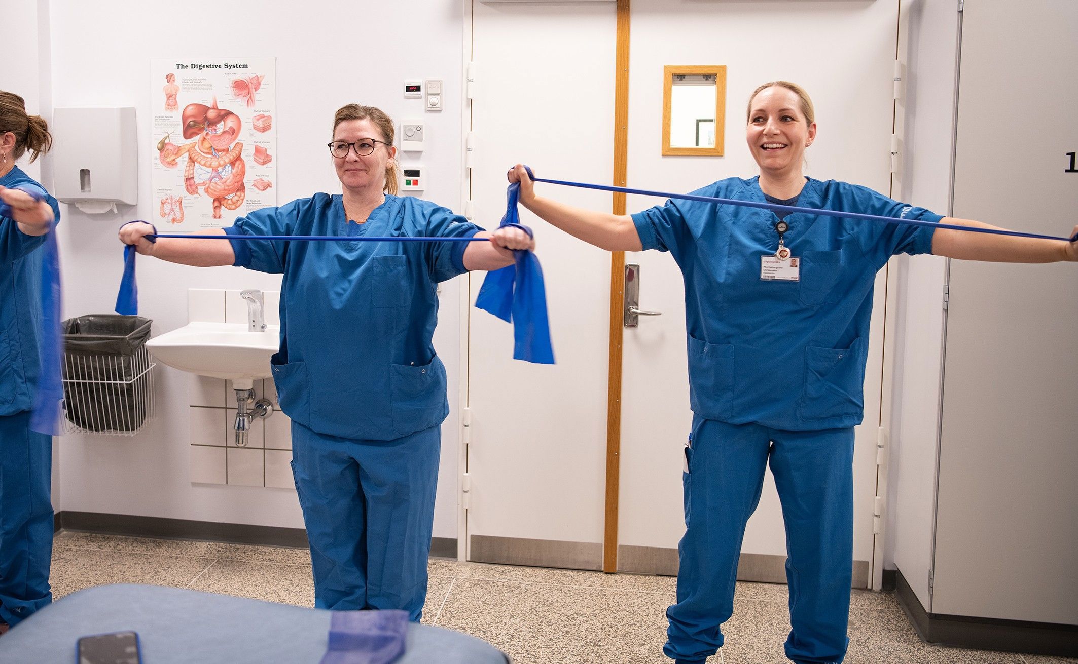 Vi har også en lille seance med gymnastik for personalet hver morgen, og det har vi selvfølgelig også denne mandag. Det er bare fem minutter, hvor vi får bevæget skuldre, nakke og ryg.